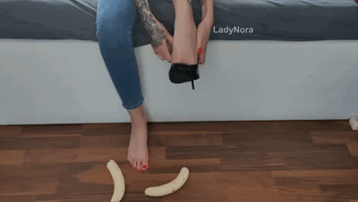 Lady Nora bought some bananas because she was craving for some smoothie, and when she got home, trying to peel them, she found that they were bad and there was nowhere she could get some others at that time of the night, and she was so frustrated that she got her shoes off and started crushing them under her feet. She crushed them until they were mushy, and she got her mood calmer